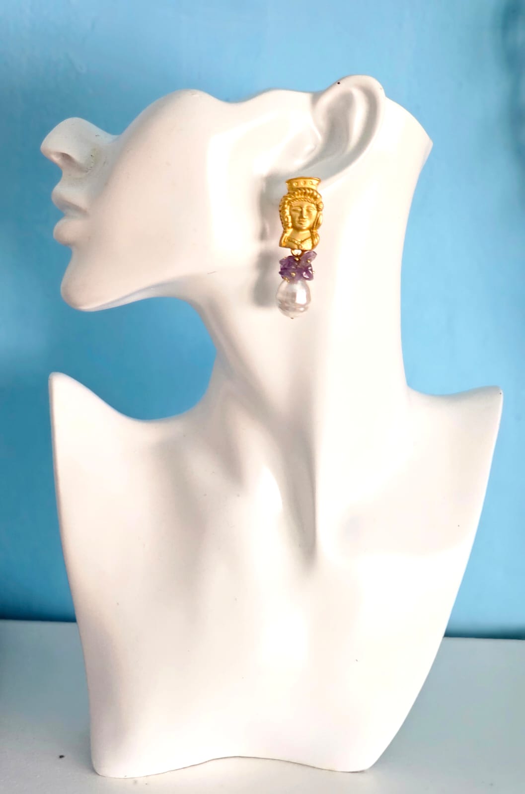 Orecchini Teste di Moro con ametista e perle - perno in zama